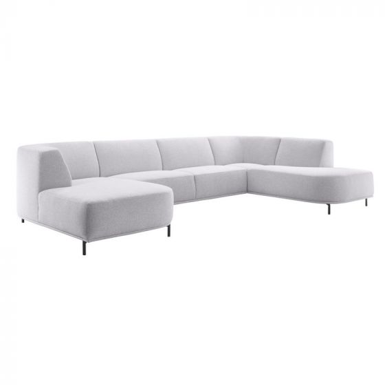 Op zoek naar een stijlvolle en comfortabele hoekbank? Dan is onze lichtgrijze hoekbank Pantini de perfecte keuze voor jou! De hoekbank is een prachtig voorbeeld waarin stijl en comfort samensmelten. Stijl in de vorm van de dunne "plint" in combinatie met de volle zitting en rugleuning en de zwarte metalen poten. De bank is bekleed met een lichtgrijs gemêleerde weefstof. Door het gebruik van verschillende garens en tinten ontstaat een licht meerkleurige kwaliteit met een ietwat grovere structuur die zacht en vol aanvoelt. In combinatie met de ronde vormen van de chaise longue en het eiland geeft dit de bank een trendy en zachte uitstraling.