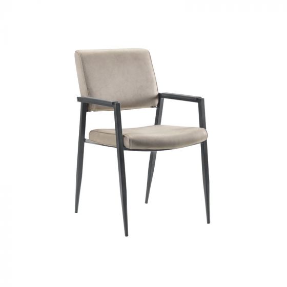 Stoel Jisca is uitgevoerd in een licht bruinige tint grijze microvezelstof met zichtbare nerven. Microvezel is een zachte, onderhoudsvriendelijke stof.