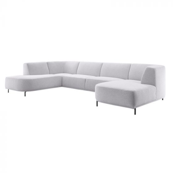 Op zoek naar een stijlvolle en comfortabele hoekbank? Dan is onze lichtgrijze hoekbank Pantini de perfecte keuze voor jou! De hoekbank is een prachtig voorbeeld waarin stijl en comfort samensmelten. Stijl in de vorm van de dunne "plint" in combinatie met de volle zitting en rugleuning en de zwarte metalen poten. De bank is bekleed met een lichtgrijs gemêleerde weefstof. Door het gebruik van verschillende garens en tinten ontstaat een licht meerkleurige kwaliteit met een ietwat grovere structuur die zacht en vol aanvoelt. In combinatie met de ronde vormen van de chaise longue en het eiland geeft dit de bank een trendy en zachte uitstraling.