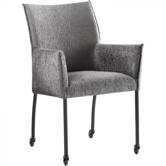 Vitale is een ranke eetkamerstoel met armleuningen met een elegante uitstraling. De stoel is uitgevoerd in een zware en stevige kwaliteit chenille meubelstof met een licht 3D effect in een grijze kleur. De stof heeft een rijke en volumineuze uitstraling en voelt daarnaast nog eens heerlijk zacht aan. De stoel is standaard voorzien van een gesloten vlindernaad, dit accentueert de belijning van de eetkamerstoel. Dankzij de zwarte wieltjes is de stoel eenvoudig en snel te verplaatsen. Op de achterzijde van de rugleuning zit een ritssluiting in dezelfde kleur als de stof.