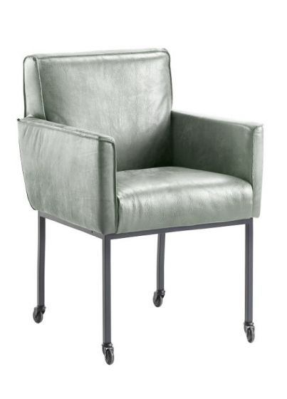 Armstoel Rona, met dichte armlegger, micro-leder Bull-Bora kleur Eucalyptus, met rechte zwarte metalen pootjes op wielen.