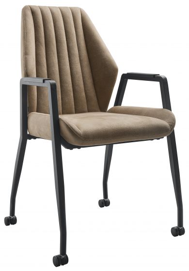 Armstoel Spacio, stof Chicago kleur Truffle (verticale banen op de rugleuning), zwart metalen pootjes met parketwielen.