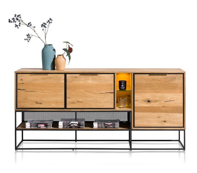 Dit industriële dressoir is afkomstig uit de City collectie. De zwart metalen accenten geven dit dressoir een opvallend lijnenspel. Het dressoir is 190 cm breed en heeft 3 deuren en 3 niches. De niches zijn voorzien van een warm ledlicht. Het dressoir is gemaakt van eikenfineer in de kleur Railway Brown. Rondom de deuren en laden zijn stalen profielen aangebracht, die het industriële karakter van dit dressoir versterken.