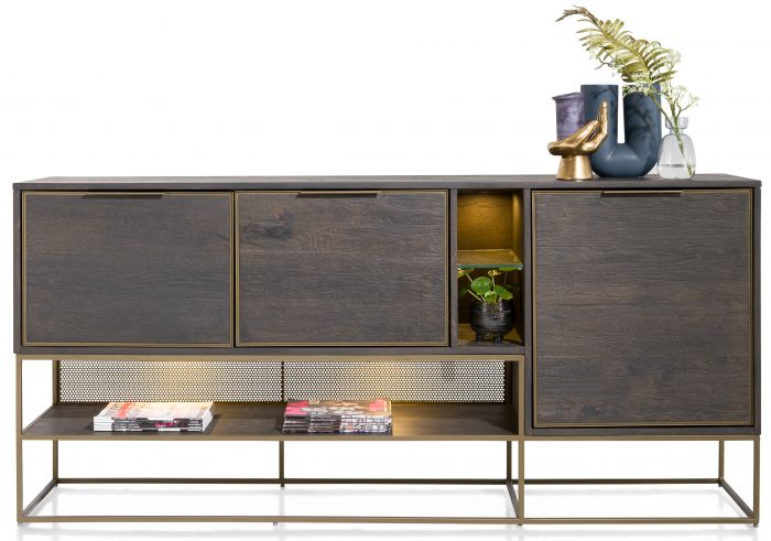 Dressoir City, eiken Castle antraciet (accenten metaal goudkleur), 3 deuren + 3 niches, inclusief LED-verlichting.