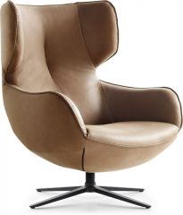 Fauteuil House of Dutchz 1801 met hoge rugleuning, stof binnenkant Brema 05 beige, leder buitenkant Mombassa cognac, zwarte 4 teens draaipoot. Met handmatig bedienbare kantelfunctie.