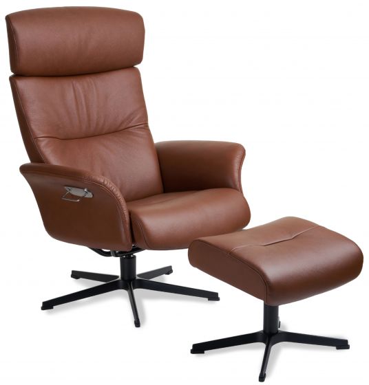 Relaxfauteuil Master Classic, leder Fantasy kleur cognac, draaivoet zwart metaal, met verstelbare hoofdsteun en rugleuning.