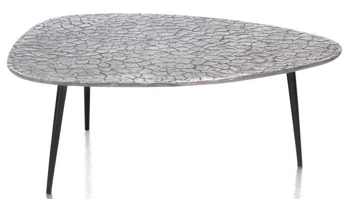 Deze salontafel uit collectie Dorval is volledig van metaal en is apart te plaatsen, maar kan ook deel uitmaken van een salontafelset. Deze salontafel meet 82x105cm en heeft een organische vorm. Het tafelblad van deze tafel is zilverkleurig met een reliëf-textuur en de tafel heeft zwarte metalen poten, maar er is ook een versie met een goudkleurig tafelblad en goudkleurige poten verkrijgbaar. Voor welke ga jij?