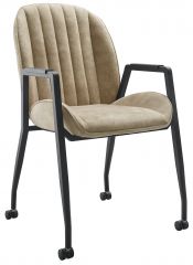 Eetkamerstoel Calci, stof Goldy kleur Latte (ruitstiksel op de rugleuning), zwart metalen slede-poot.