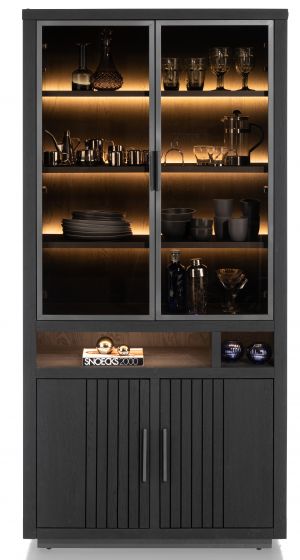 Vitrinekast Pavie, 2 glasdeuren + 2 deuren + 2 open vakken, eiken kleur Castle black, 100 cm breed. Inclusief LED-verlichting.